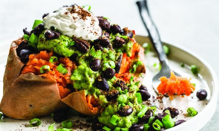Preheat the oven to 200 °C (400 °F). Line baking sheet with parchment paper. Wash the sweet potatoes, and with a fork poke several holes into each potato. Place on a baking sheet and roast for 45–75 minutes (timing depends on the size), until the flesh is tender and you can easily slide a knife through the center. After baking, let the potatoes cool for 5–10 minutes. - For the avocado cilantro crema